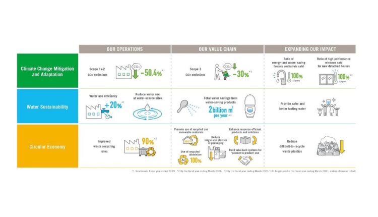 وبشأن كل قضية من هذه القضايا الثلاث، تضع الاستراتيجية أهدافاً معيّنة وتسعى لتحقيقها على المدى المتوسط عبر عمليات LIXIL وسلسلة القيمة الخاصة بها وغيرها من العمليات، وذلك بهدف زيادة التأثير الإيجابي للشركة على التحديات البيئية والاجتماعية في جميع أنحاء العالم.