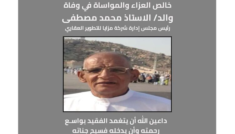 وفاة والد الأستاذ محمد مصطفى رئيس مجلس إدارة شركة مزايا للتطوير العقاري أخبار بواسطة Tadawul News آخر تحديث يونيو 1, 2024 شارك تابعنا على جوجل نيوز يشاطر العاملون في شركة مزايا للتطوير العقاري الاستاذ محمد مصطفى، رئيس مجلس إدارة شركة مزايا للتطوير العقاري في وفاة والده السيد/ مصطفى علي حسن. داعين المولي عزوجل أن يتغمد الفقيد بواسع رحمته ويسكنه فسيح جناته، ويلهم ذويه الصبر والسلوان. مزايا للتطوير العقاري شارك