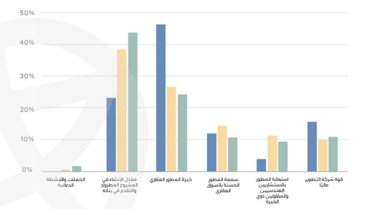 وفي المقابل، وضح التقرير اتجاه النسبة الأكبر من مشترين العقارات من الطبقة متوسطة الدخل والطبقة منخفضة الدخل بالمجتمع لشراء العقار بناء على معدل الإنشاء في المشروع المطروح والتقدم في بنائه، ونسبة 20% من مشتري العقارات لاختيار المطور المناسب على أساس خبرة المطور وقدرته على التعامل مع مشروعاته السابقة بكفاءة وفعالية.