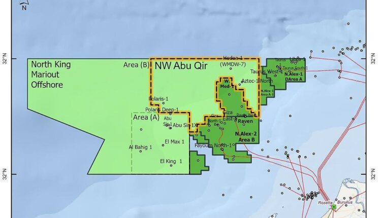 يقع الامتياز الأول “شمال غرب أبو قير البحرية” شرق منطقة شمال كينج مريوط وشمال حقل رافين وتبلغ مساحة ذلك الامتياز حوالي 1038 كيلومتر مربع على عمق يتراوح ما بين 600 و1600 متر حيث تمتلك شركة بى بى المشغل لمنطقة الامتياز 82.75٪ وشركة وينترشال ديا 17.25% من حقوق التنقيب.